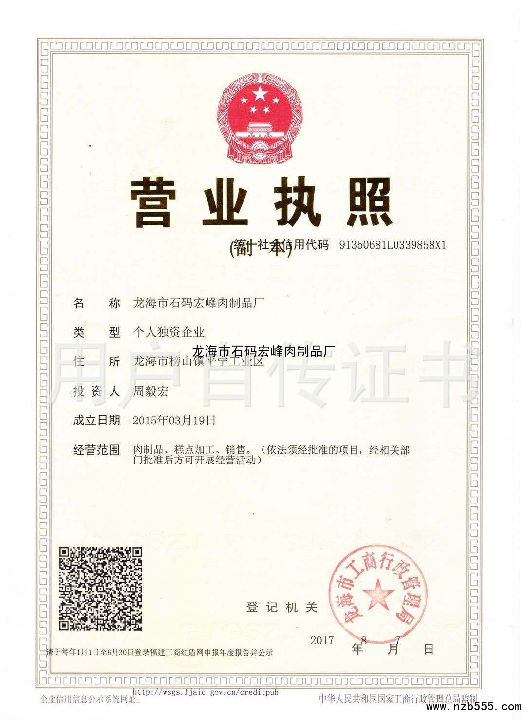 | 發(fā)證機(jī)構(gòu): | 龍海市工商行政管理局 | 發(fā)證時(shí)間 : | 2017-08-07 |