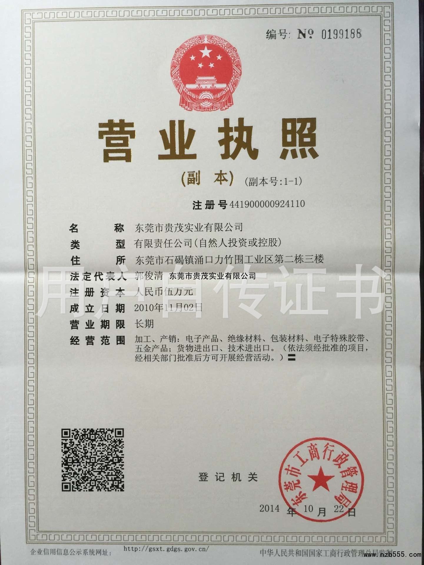 | 發(fā)證機(jī)構(gòu): | 東莞市工商行政管理局 | 發(fā)證時(shí)間 : | 2014-10-22 |