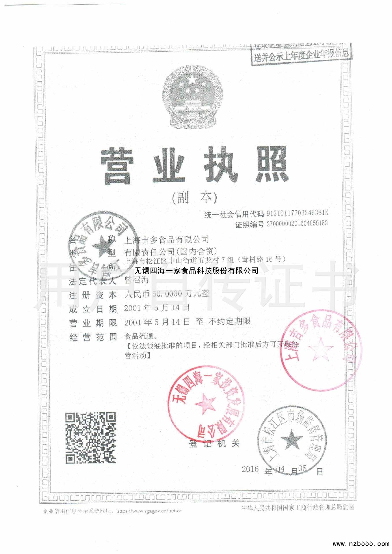 首頁 > 榮譽(yù)資質(zhì) > 無錫四海一家食品科技股份有限公司