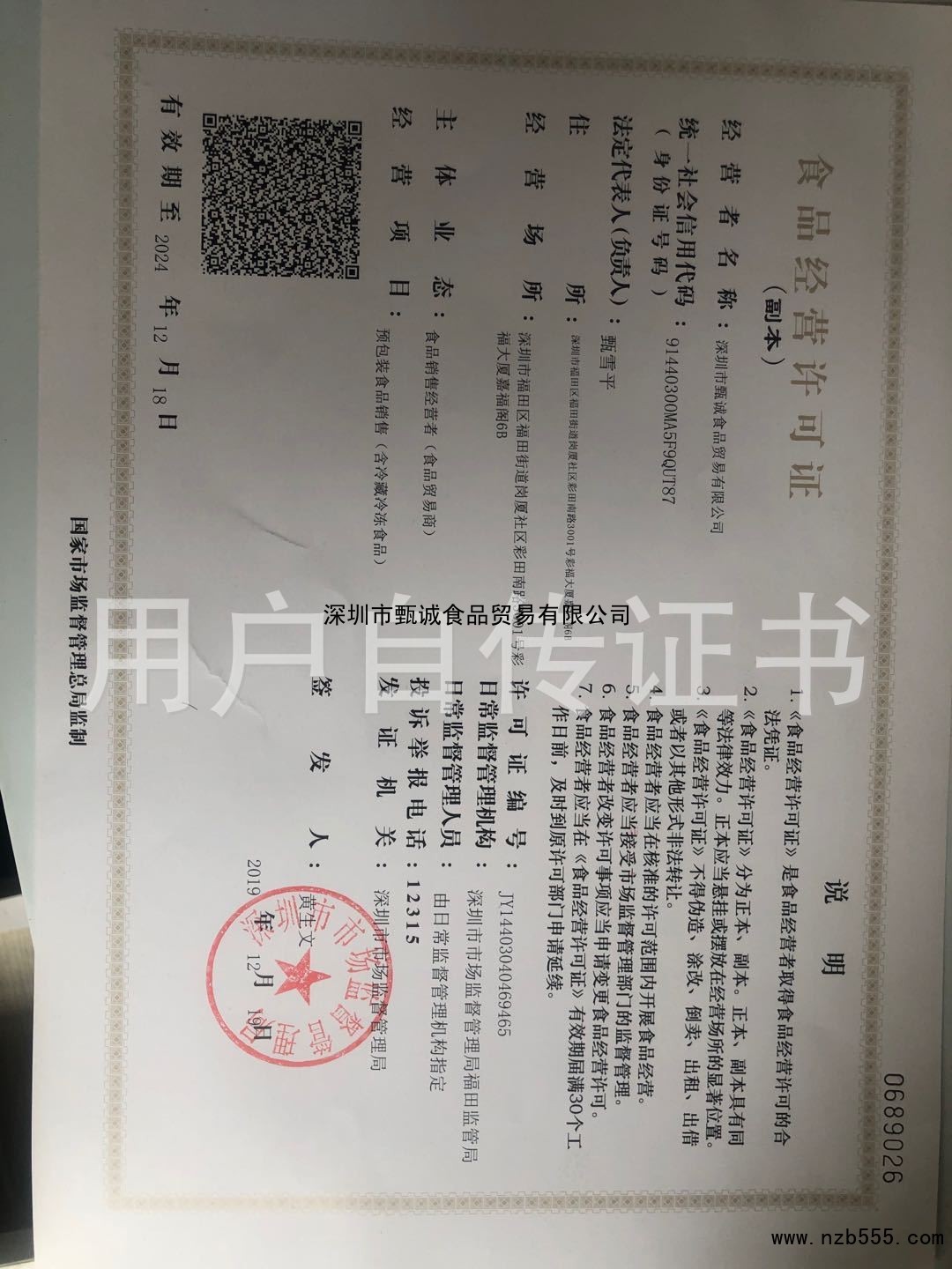 榮譽(yù)資質(zhì) 深圳市甄誠食品貿(mào)易有限公司