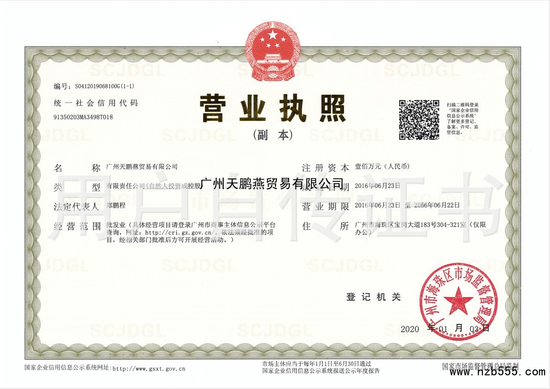 | 發(fā)證機(jī)構(gòu): | 廣州珠海市市場(chǎng)監(jiān)督管理局 | 發(fā)證時(shí)間 : | 2020-01-03 |