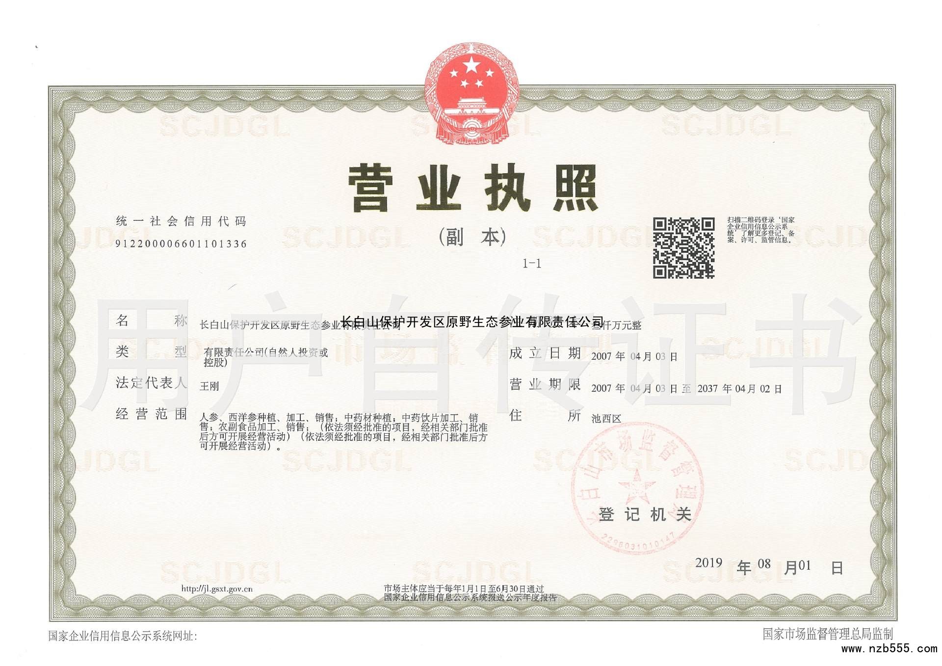 | 發(fā)證機(jī)構(gòu): | 長白山市場監(jiān)督管理局 | 發(fā)證時間 : | 2019-08-01 |